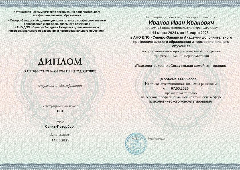 Курс обучения Психолог-сексолог. Сексуальная семейная терапия (1445ч)