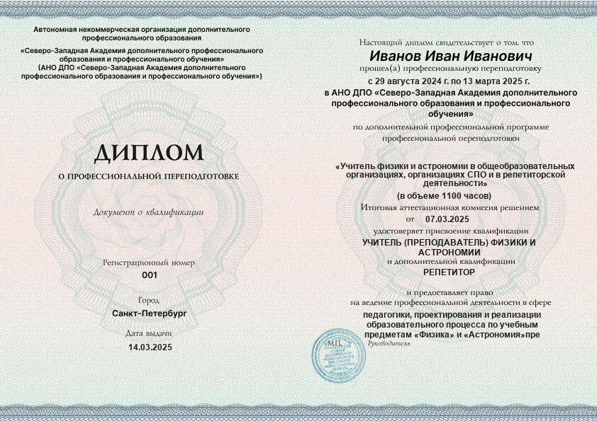 - 2 квалификации: Учитель (преподаватель) физики и астрономии + Репетитор